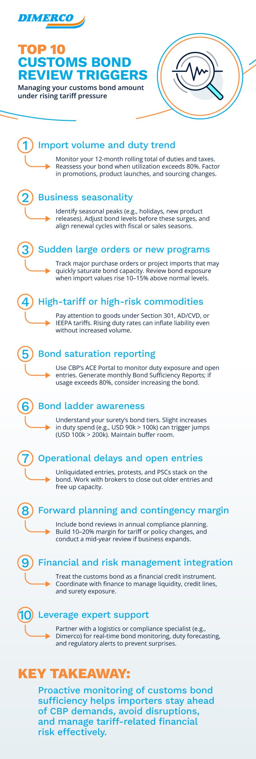 For those operating in high risk categories, such as those impacted by IEEPA actions, AD CVD measures, or Section 301 tariffs, additional margin should be built into bond planning. The best defense in these cases is careful preparation.