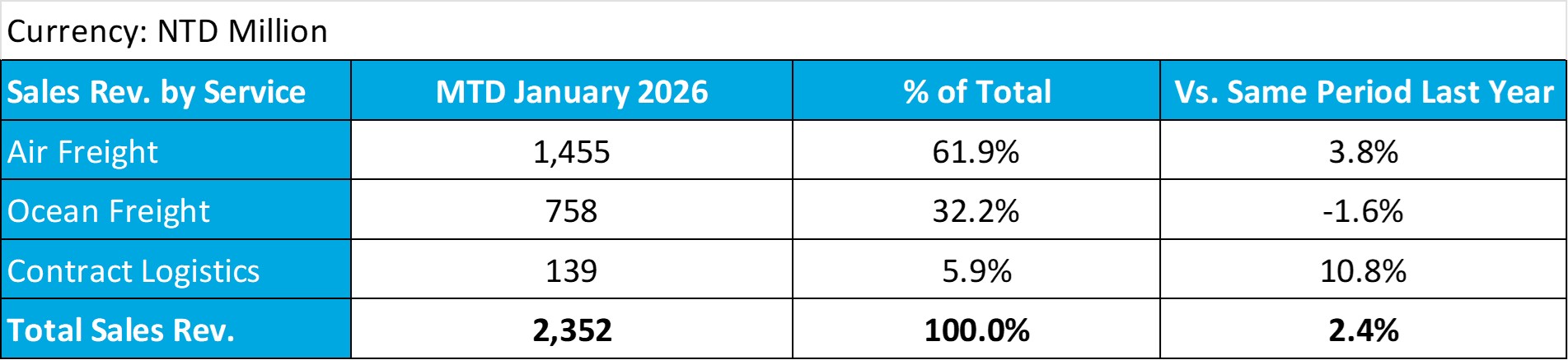Dimerco Express Group (5609) today announced the consolidated sales revenue for January 2026, reaching NT$2,352 million, a 2.4% increase compared to the same period last year. The growth was driven by continued expansion in shipping volumes. Overall freight volumes in January showed strong performance compared with the same period last year, with air freight volumes increasing by nearly 30% and ocean freight volumes rising by nearly 20%. However, due to a decline in overall market freight rates compared with the same period last year, the pace of revenue growth was moderated to some extent.